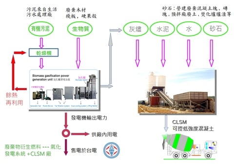 本系統的廢棄物衍生燃料之原料為一般污泥包含有機性污泥(D-0901)、釀酒污泥(R-0903)、漿紙污泥(R-0904)、木質棧板 (D-0701) 、木材混合物 (D-0799)、稻殼、 椰子殼等。生質物經過氣化後灰渣排出爐體外可供可控性低強度材料(CLSM)、3D列印混凝土摻合料或水泥預製製品之摻合料 , 生成氣體(合成氣)(合成氣體主要成份: CO、CO2、H2、CH4等, 其中CO、H2主要為能源再利用)經過淨化處理後供內燃機引擎燃料轉動而帶動發電機組發電。所發電力可供廠內動力用電而多餘電力出售給臺電(每度電約3.9元)。